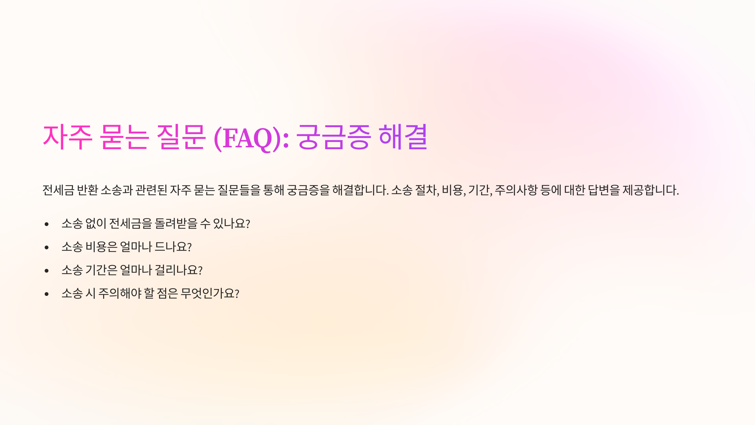 전세금 반환 문제는 소송 없이 해결하는 것이 가장 좋아요. 소송은 시간과 비용이 많이 들기 때문에, 사전 예방과 협상으로 해결하는 것이 유리해요.